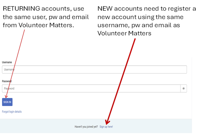 Please use the same credentials from Volunteer Matters, whether you're signing up or a returning volunteer